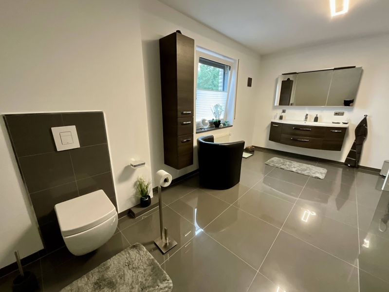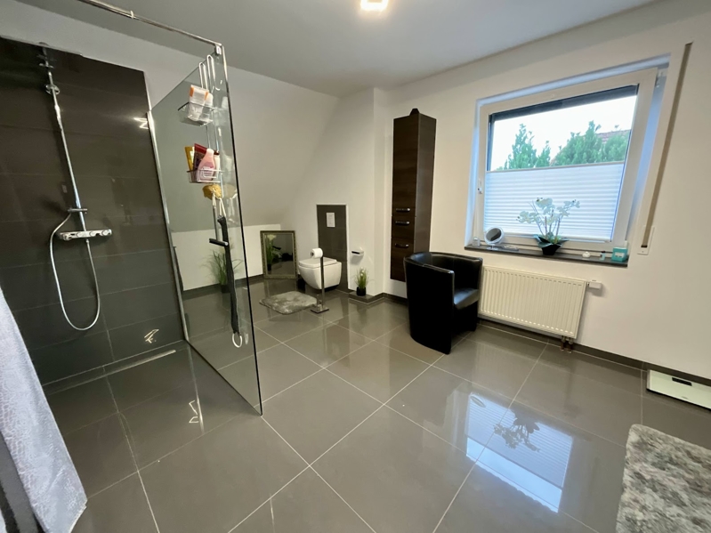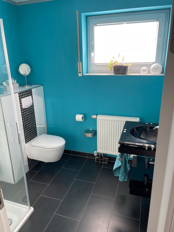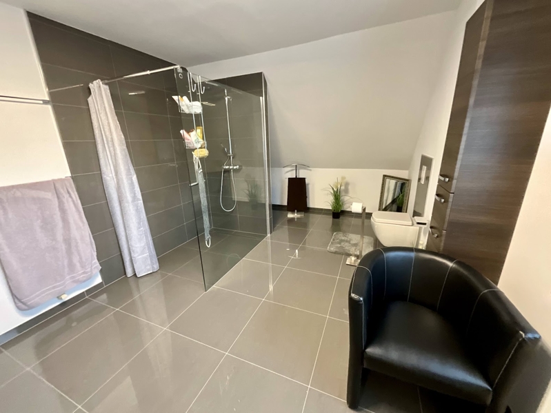 Das Badezimmer wurde frisch modernisiert und verfügt über eine ebenerdige große Dusche, ein WC und einen großen Waschtisch.
