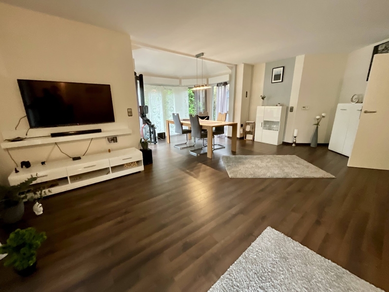 Eingangsbereich überdacht mit geräumiger Diele und Aufgang in das Obergeschoss. Die Küche (11,74 m²) bietet Platz für das gemeinsame Kochen, ein lichtdurchfluteter Wohn- und Essbereich mit Erker (43,43 m²) bietet Platz für die ganze Familie und einen Ausgang auf die nachträglich verglaste Terrasse mit Blick in den wunderschön angelegten Garten mit Fisch- und Badeteich.