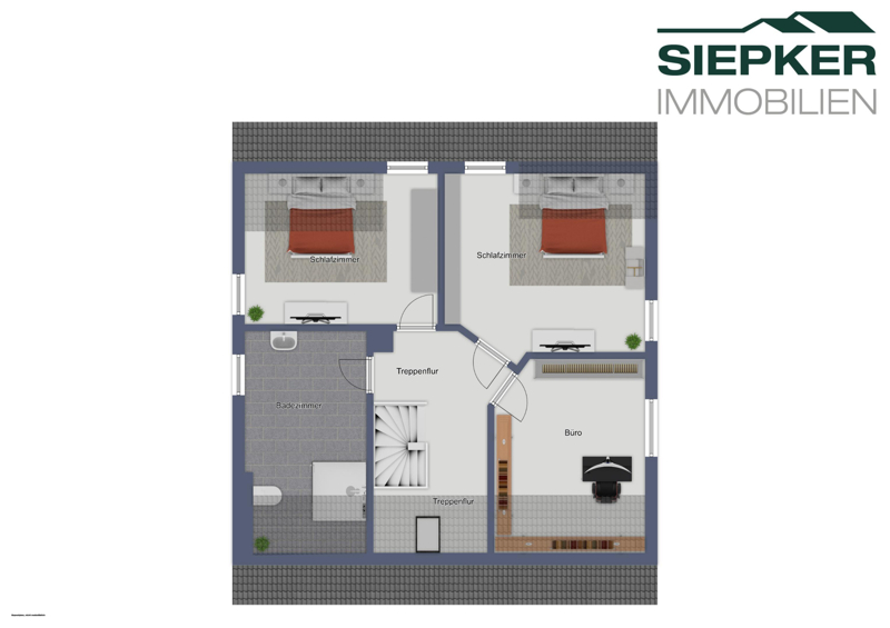 Über eine offene Stahlharfentreppe gelangen Sie in das Obergeschoss. Hier empfängt Sie ein großzügiger Flur, von dem aus Sie alle drei Schlafzimmer (17,23, 21,04 und 16,99 m²) erreichen.