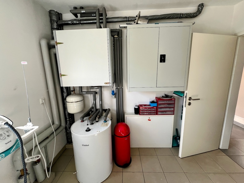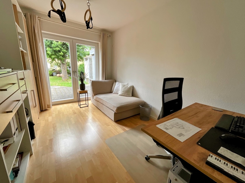 Auf gleicher Ebene befindet sich des Weiteren ein Arbeitszimmer (10,52 m²) mit direktem Zugang in den Garten, ein modernes Gäste-WC (2,01 m²) mit Fenster und der Hauswirtschaftsraum (9,96 m²). Hier befindet sich auch die Fernheizung mit der modernen Fußbodenheizung, sämtliche Hausanschlüsse sowie Stellplätze für Waschmaschine und Trockner.