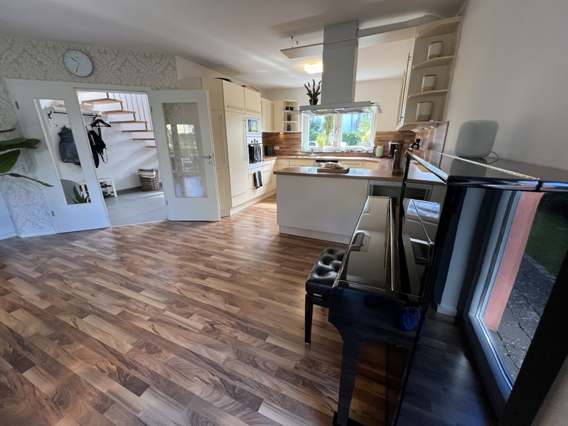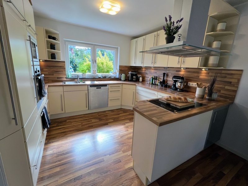 Eine offene Wohnküche mit einer Kochinsel ist der Treffpunkt für die ganze Familie. Die gemütliche Küche wurde 2005 mit einer modernen Einbauküche ausgestattet. Die Einbauküche verbleibt im Haus und ist bereits im Kaufpreis enthalten.