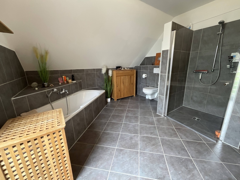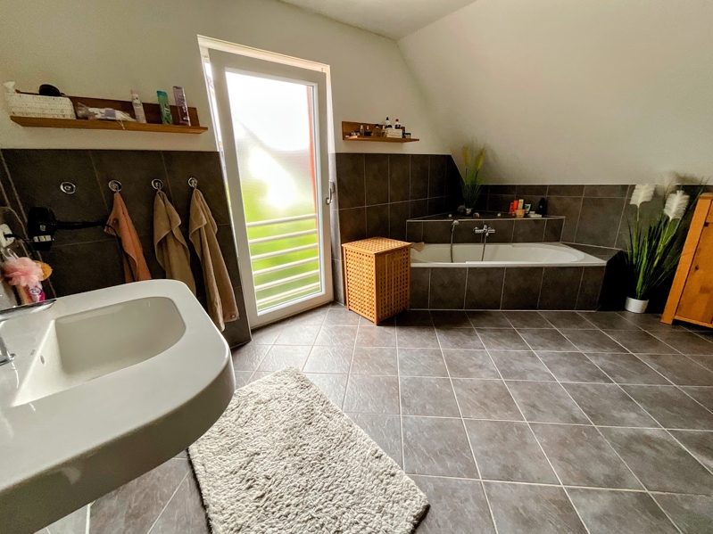 Ein großes modern gefliestes Tageslicht-Badezimmer (13,71 m²) mit begehbarer Dusche, einer Badewanne, einem Waschtisch, Fußbodenheizung und WC sorgt für einen gut gelaunten Start in den Tag.