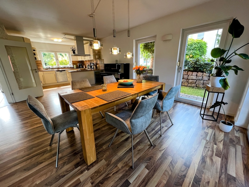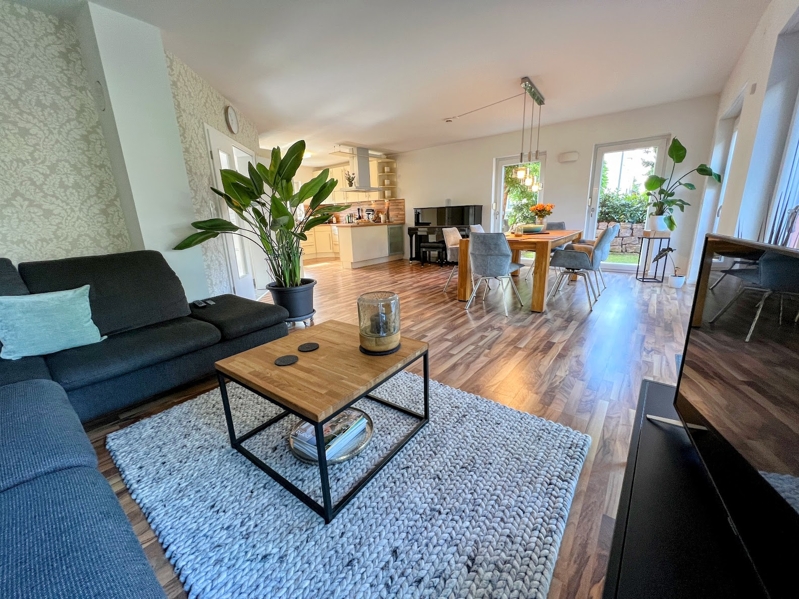 Von der Küche aus genießen Sie den Blick in den großzügigen, licht durchflutete Wohn- und Essbereich (45,72 m²) mit direktem Zugang zur Terrasse und einem Blick in den pflegeleicht und kaum einsehbaren Garten.