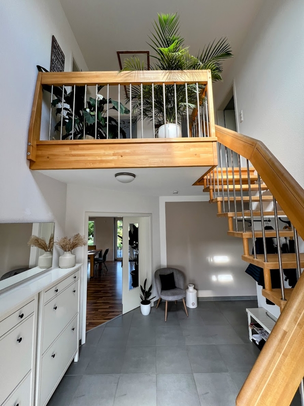 Sobald Sie das Haus betreten, empfängt Sie eine großzügige Diele (12,11 m²) mit Galerie, großflächigen Granitfliesen und einem offenen Aufgang ins Obergeschoss.