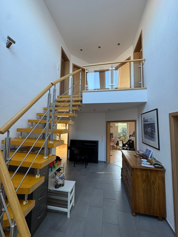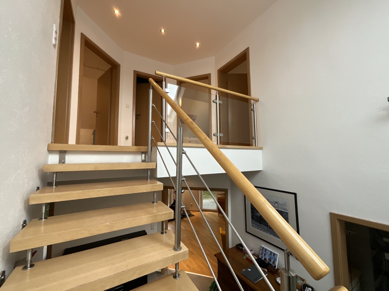 Über eine Stahltreppe mit Holzstufen erreichen Sie das Obergeschoss, wo Sie eine helle Galerie mit Blick in den Eingangsbereich des Erdgeschosses empfängt. Von der Galerie gelangen Sie in die drei geräumigen Schlafzimmer, die mit Laminat ausgelegt sind.