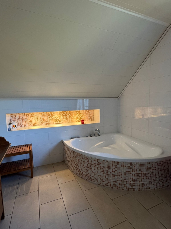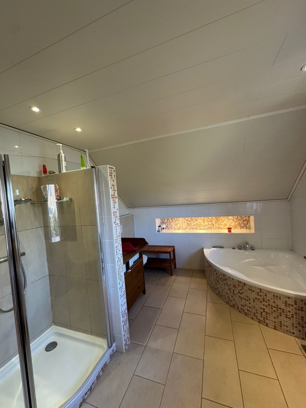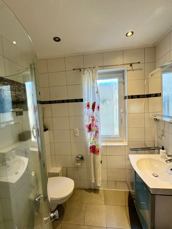 Das moderne Tageslichtbad verfügt über eine Eckbadewanne, Dusche, und einen Waschtisch. Ein Abstellraum, der sich direkt neben einem der Schlafzimmer befindet, bietet Platz für diverse Gegenstände oder könnte als Ankleideraum genutzt werden.