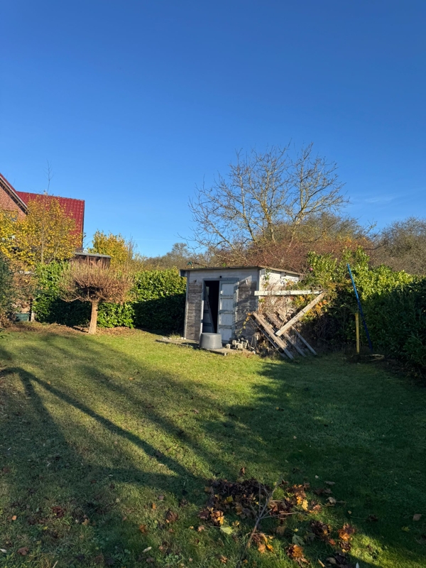 Das bereits angewachsene Grundstück schützt vor neugierigen Blicken und ein Gartenhäuschen bietet Platz für Gartenmöbel und Geräte.